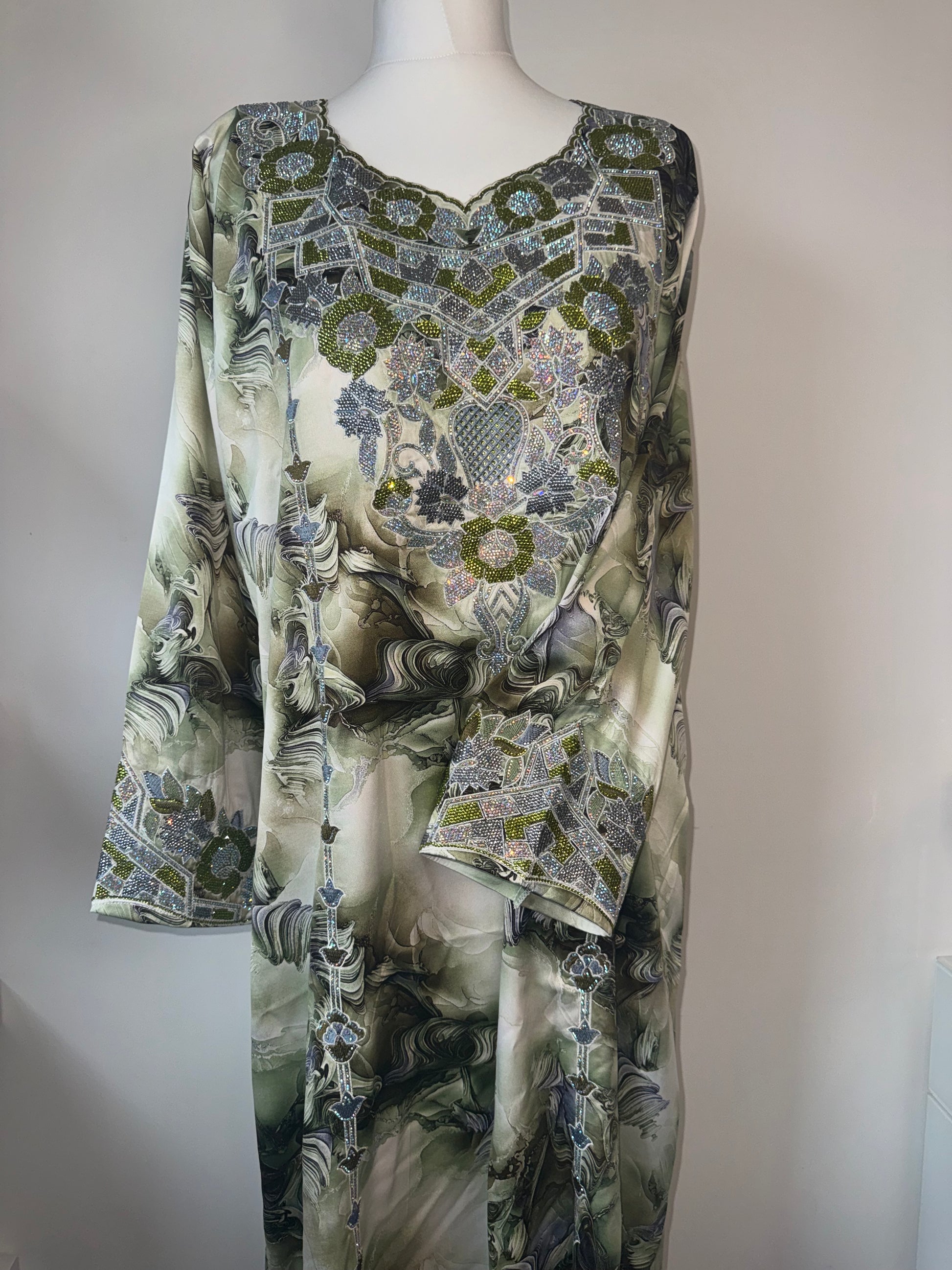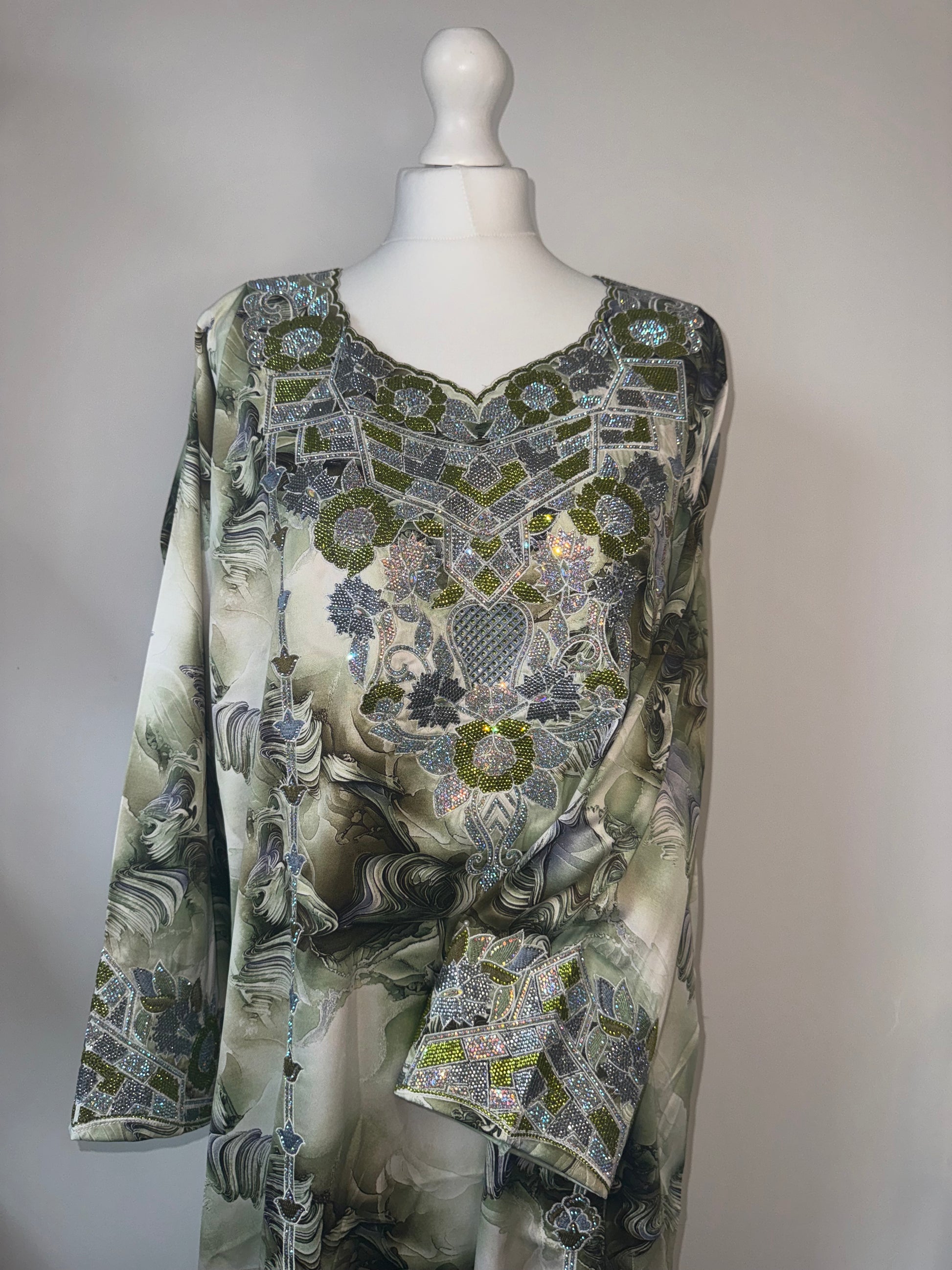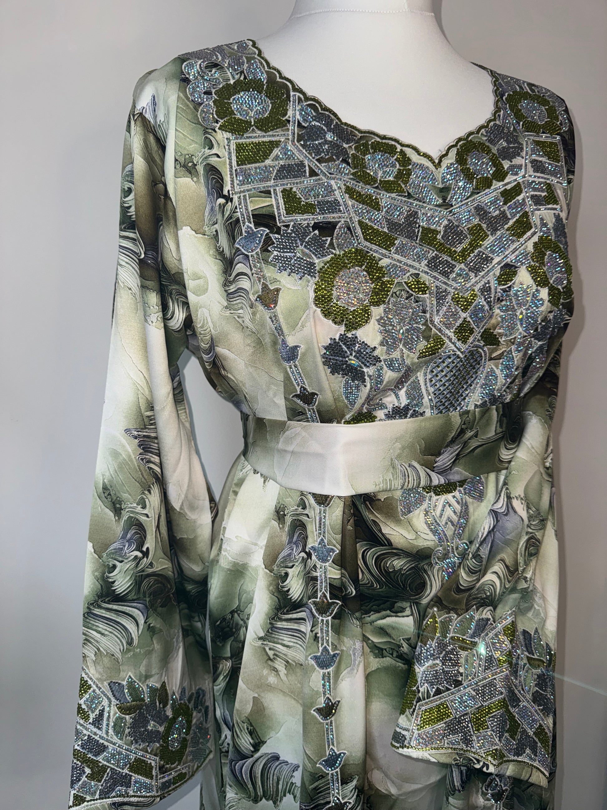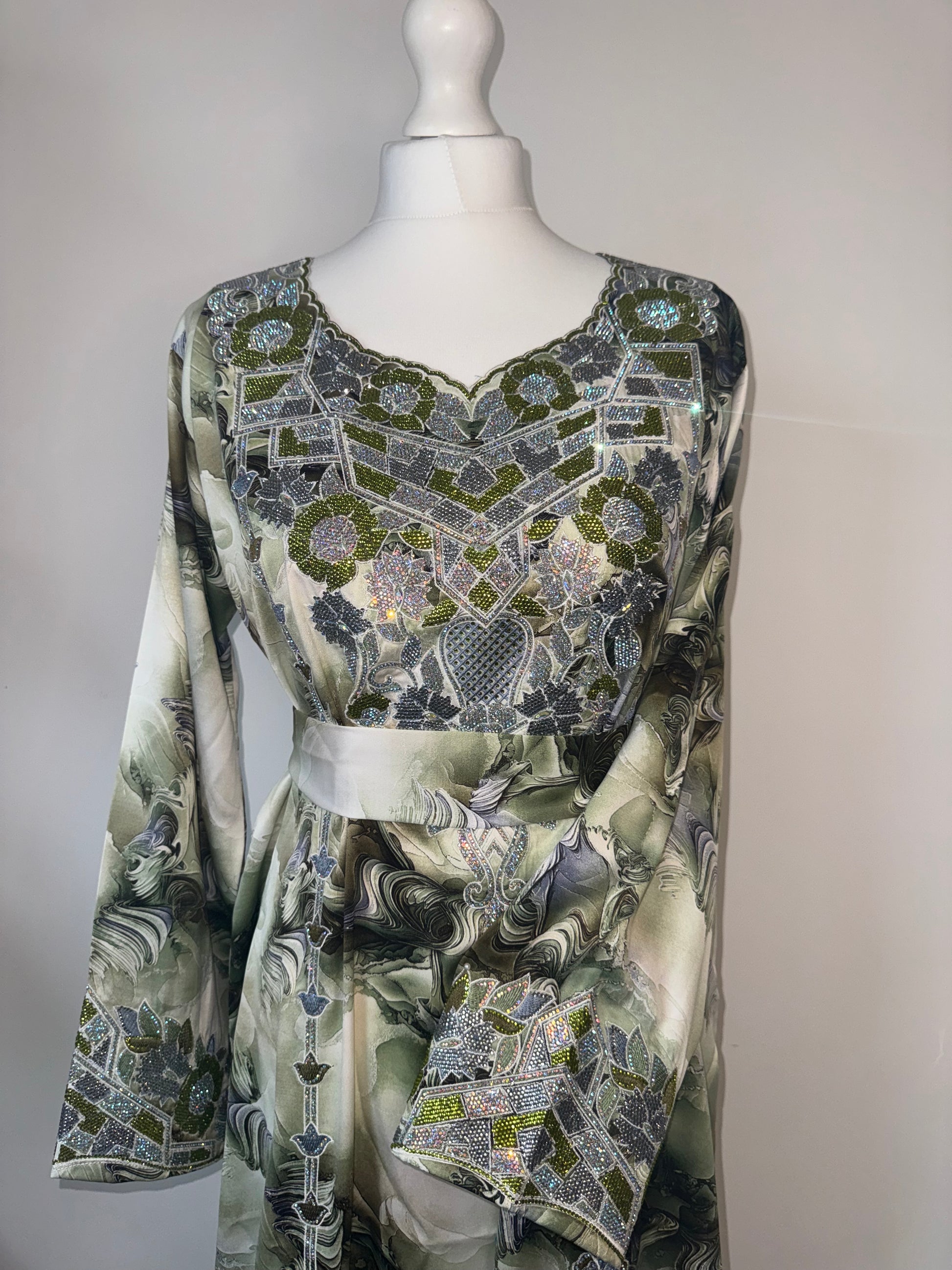 Elevate your abaya by pairing it with one of our stunning Mukhawara. This beauty is from our heavily embellished range featuring diamanté work on full sleeves aswell as full front. This style comes with a belt.