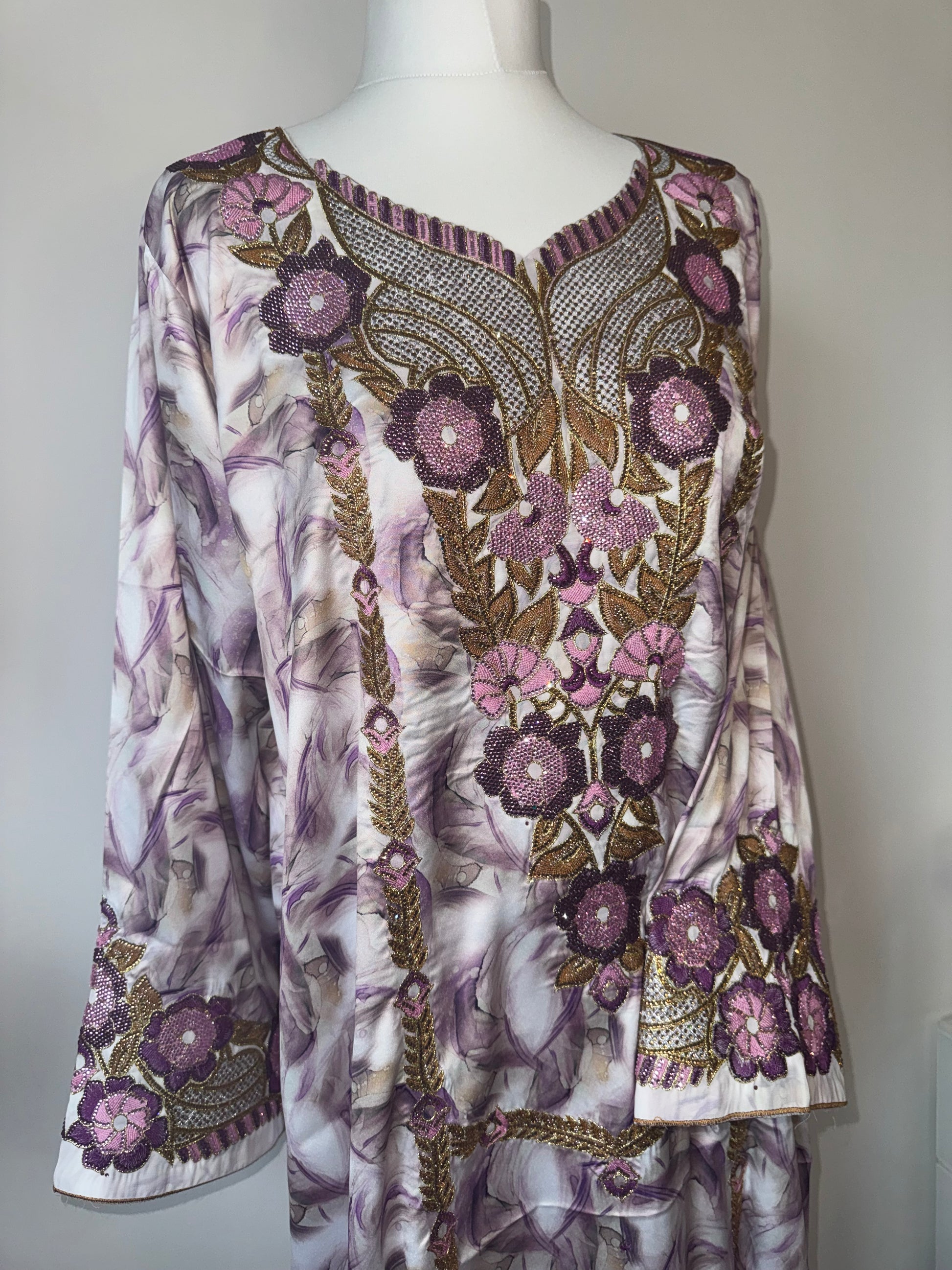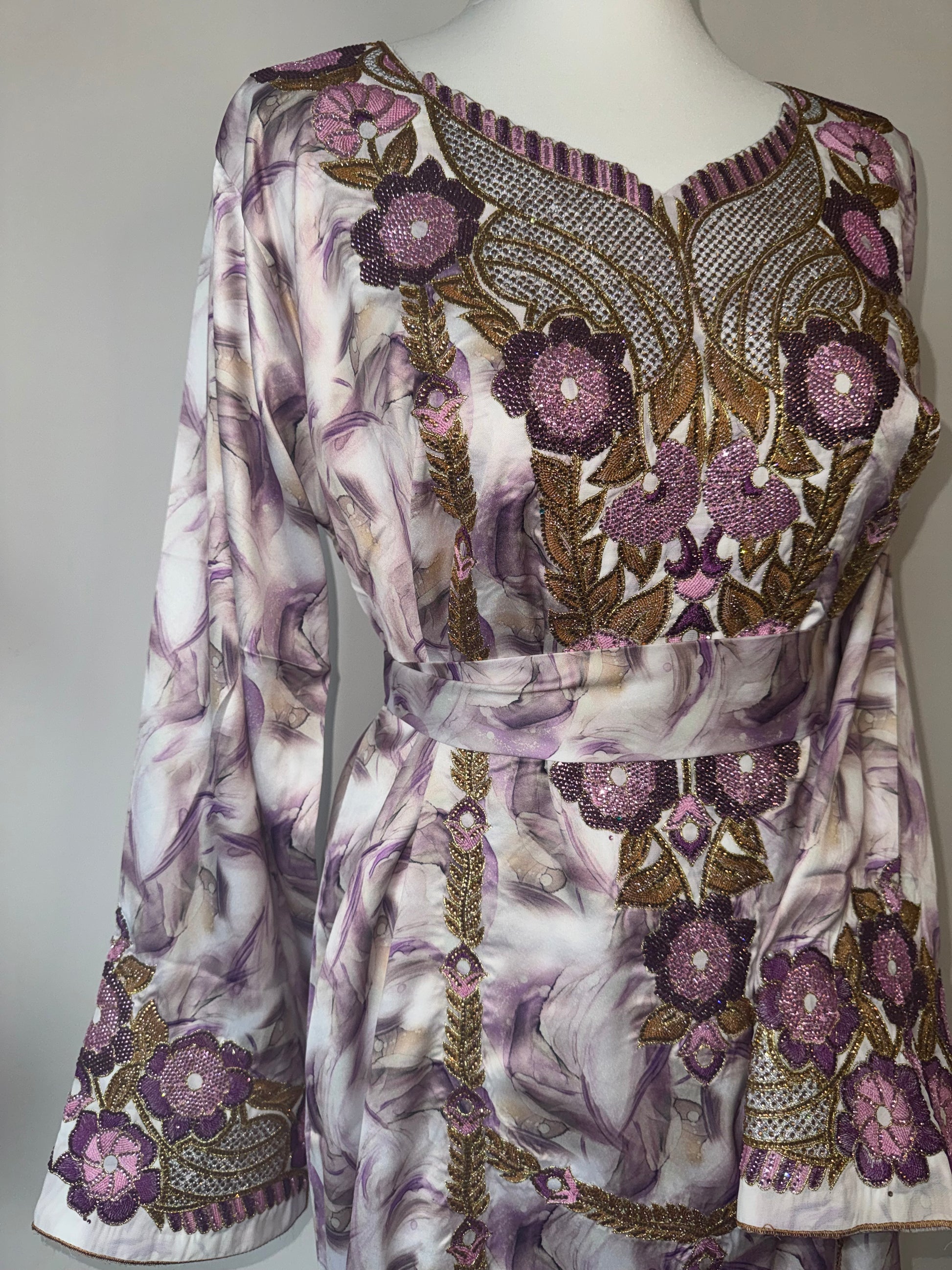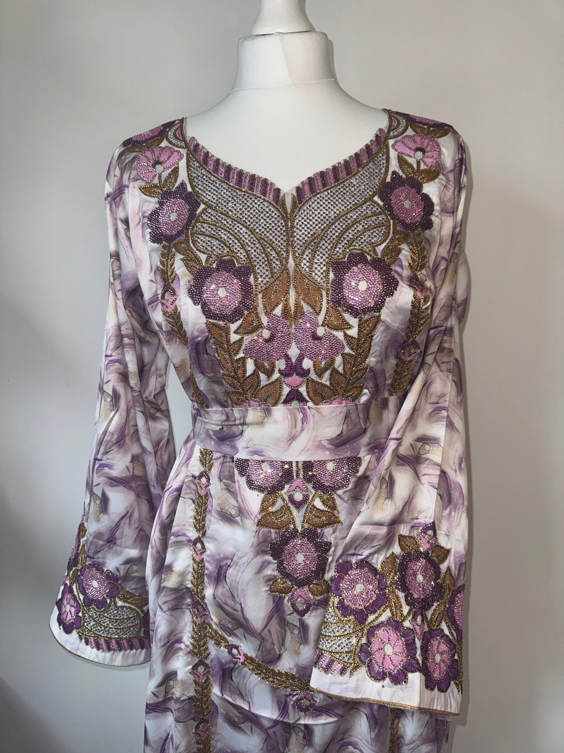 Elevate your abaya by pairing it with one of our stunning Mukhawara. This beauty is from our heavily embellished range featuring diamanté work on full sleeves aswell as full front. This style comes with a belt.