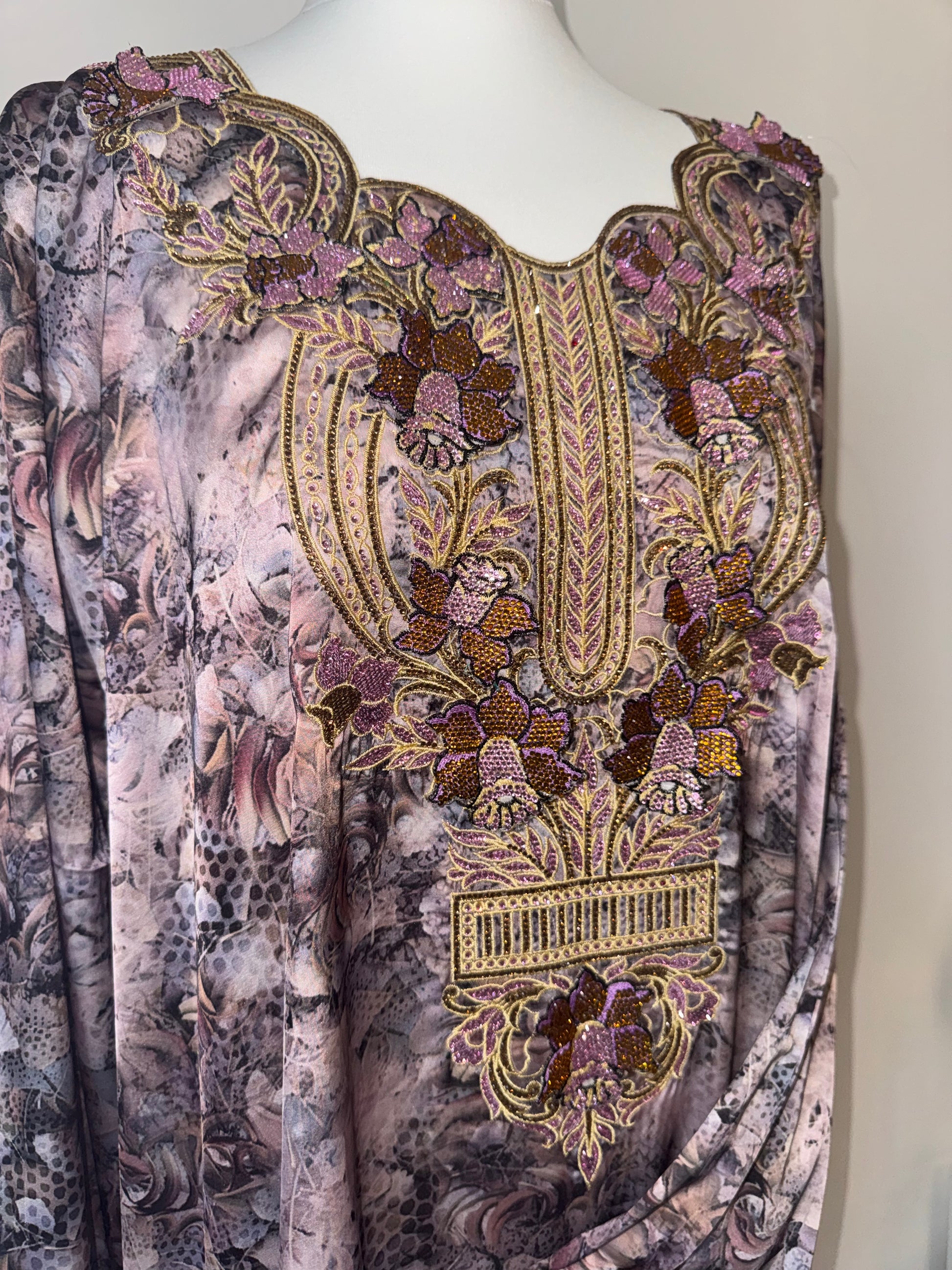 Elevate your abaya by pairing it with one of our stunning Mukhawara. This beauty is from our heavily embellished 3D range featuring diamanté work on sleeves aswell as front. This style comes with a belt.